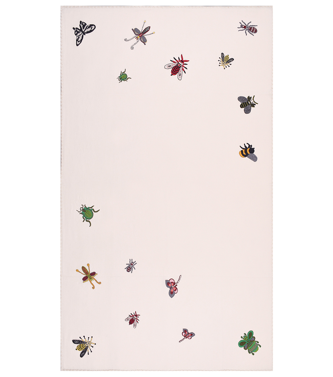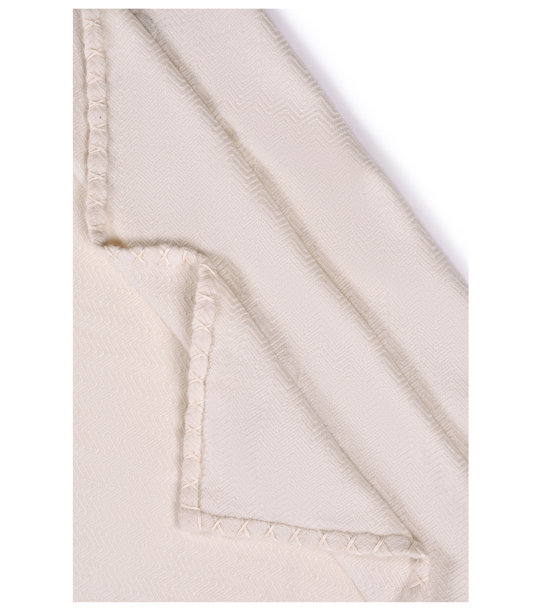Embroidered herringbone weave blanket woven in pure cashmere, on an ivory base, with tonal cross stitch edging.